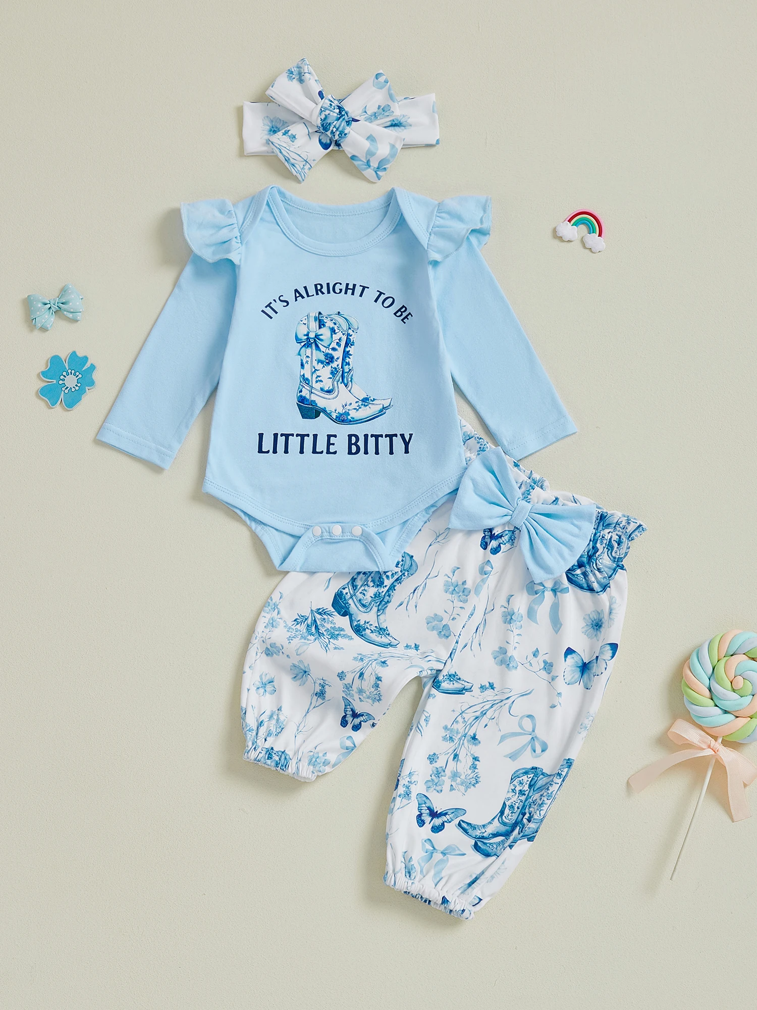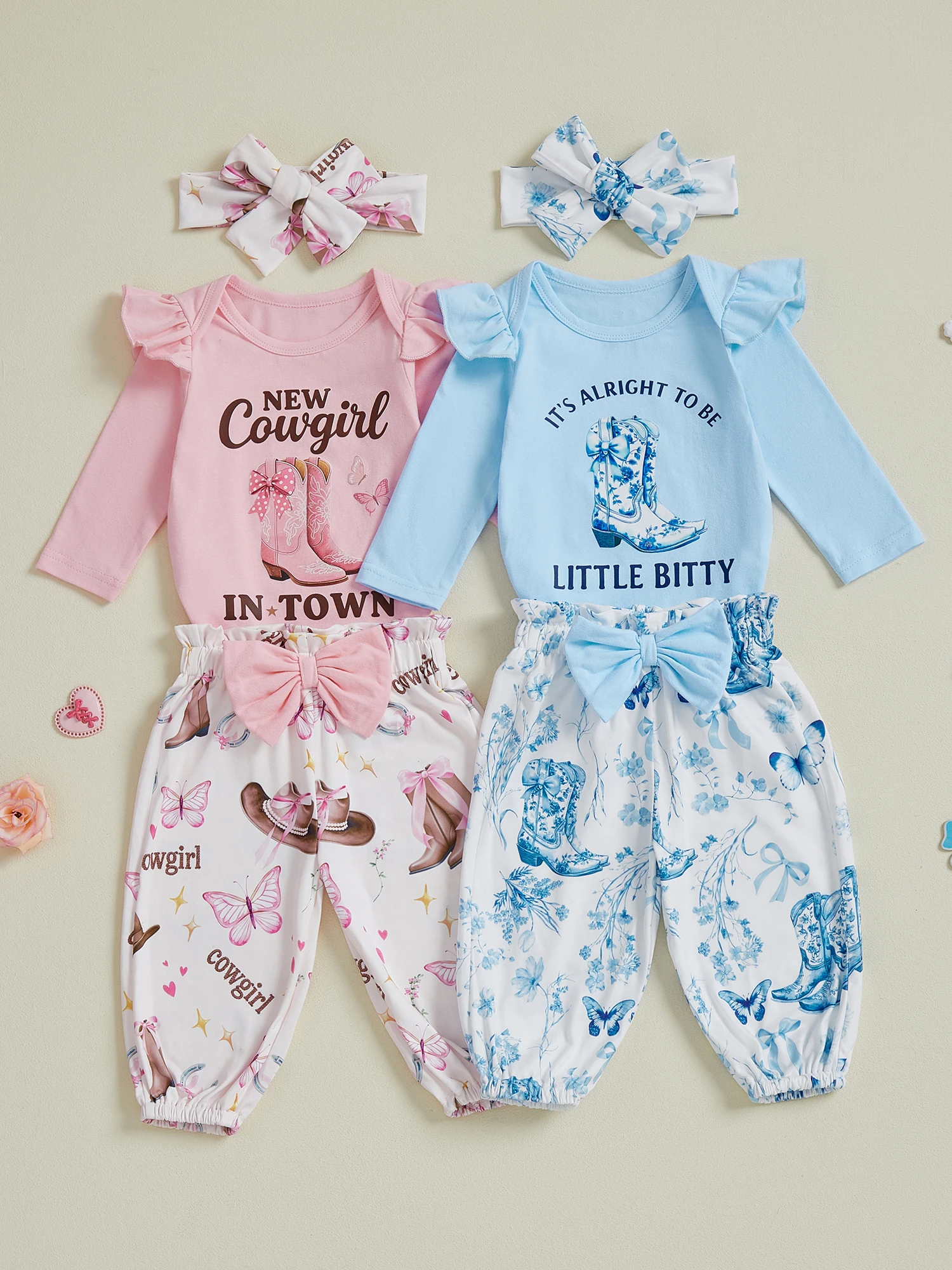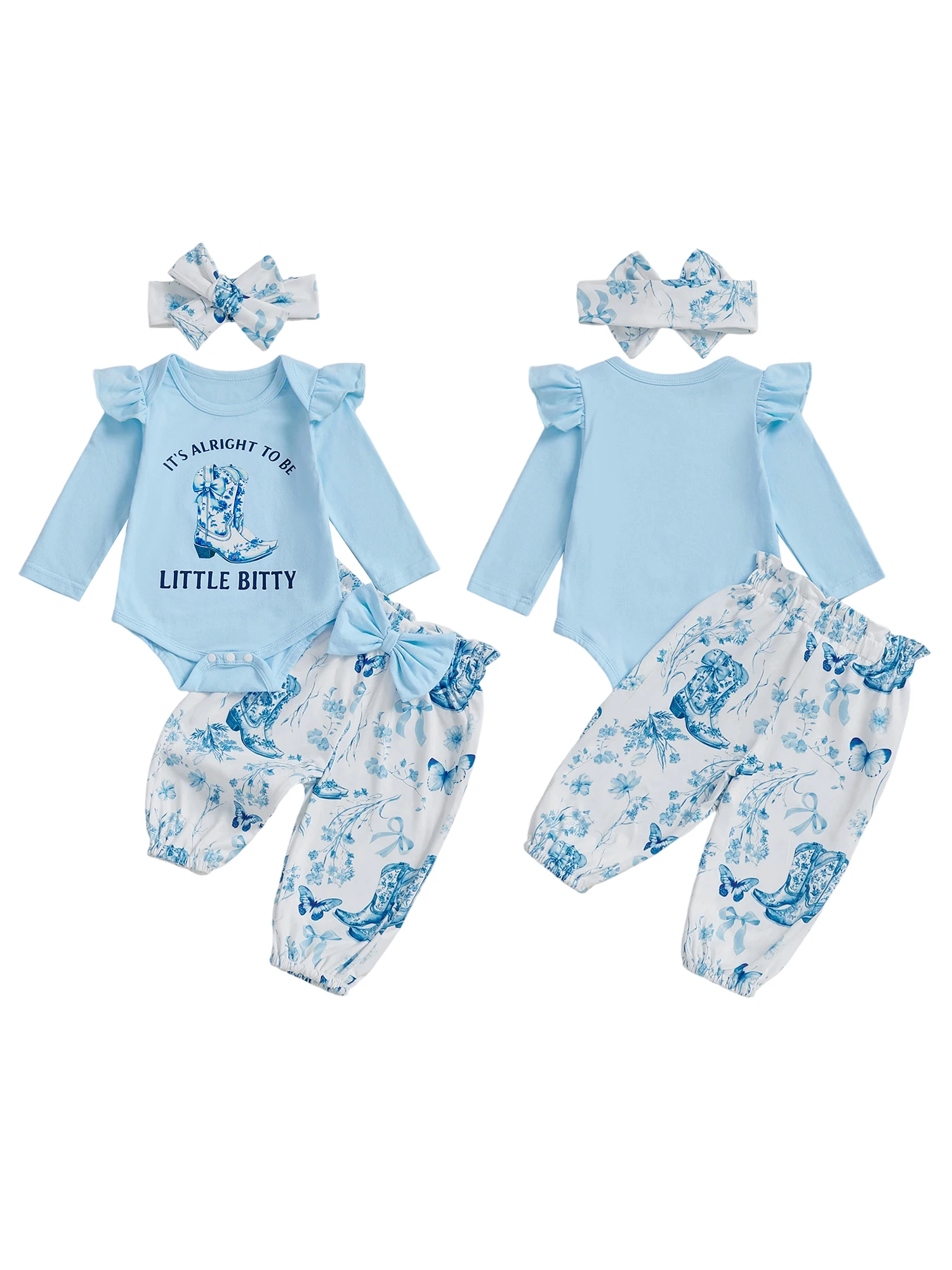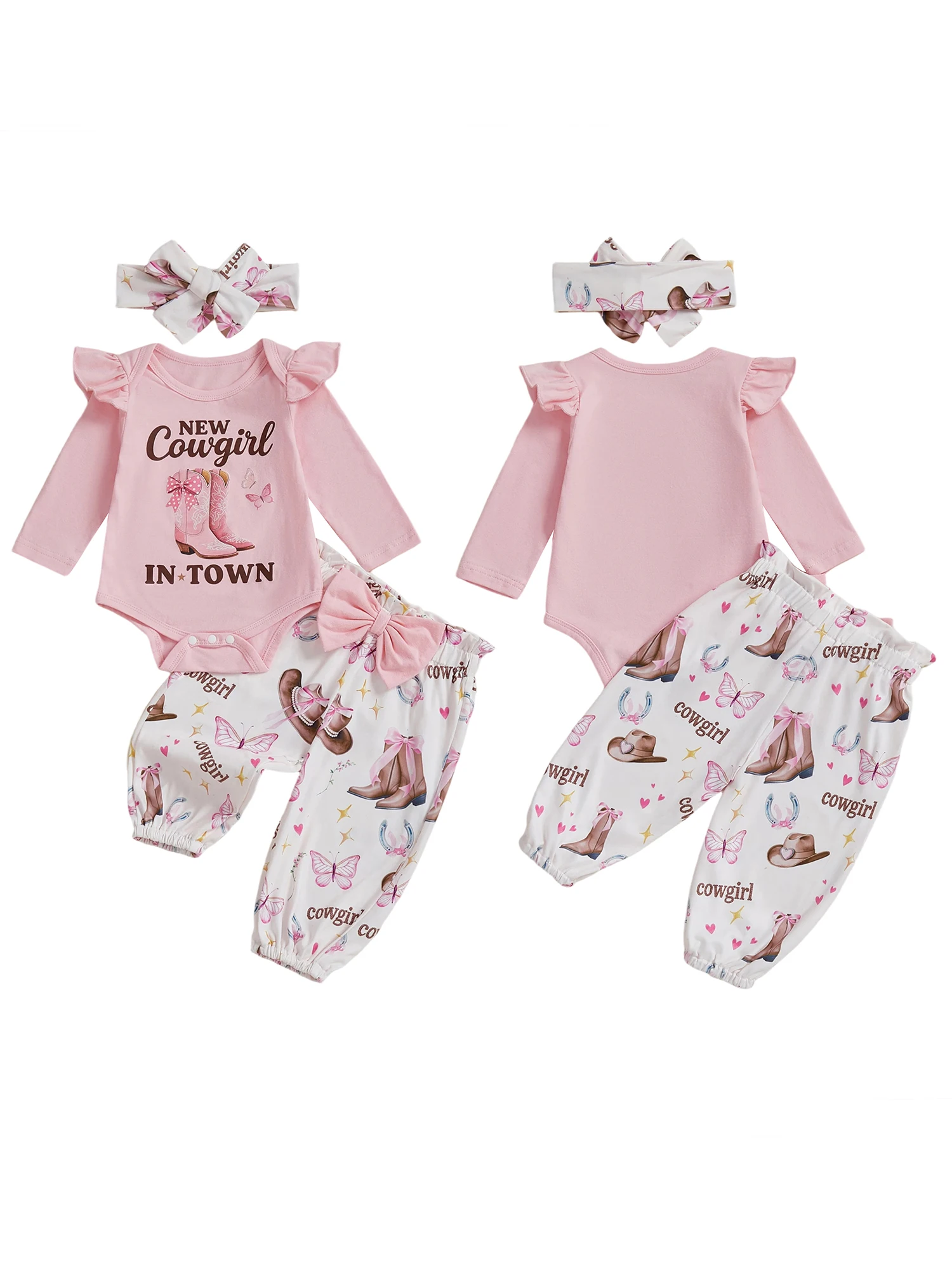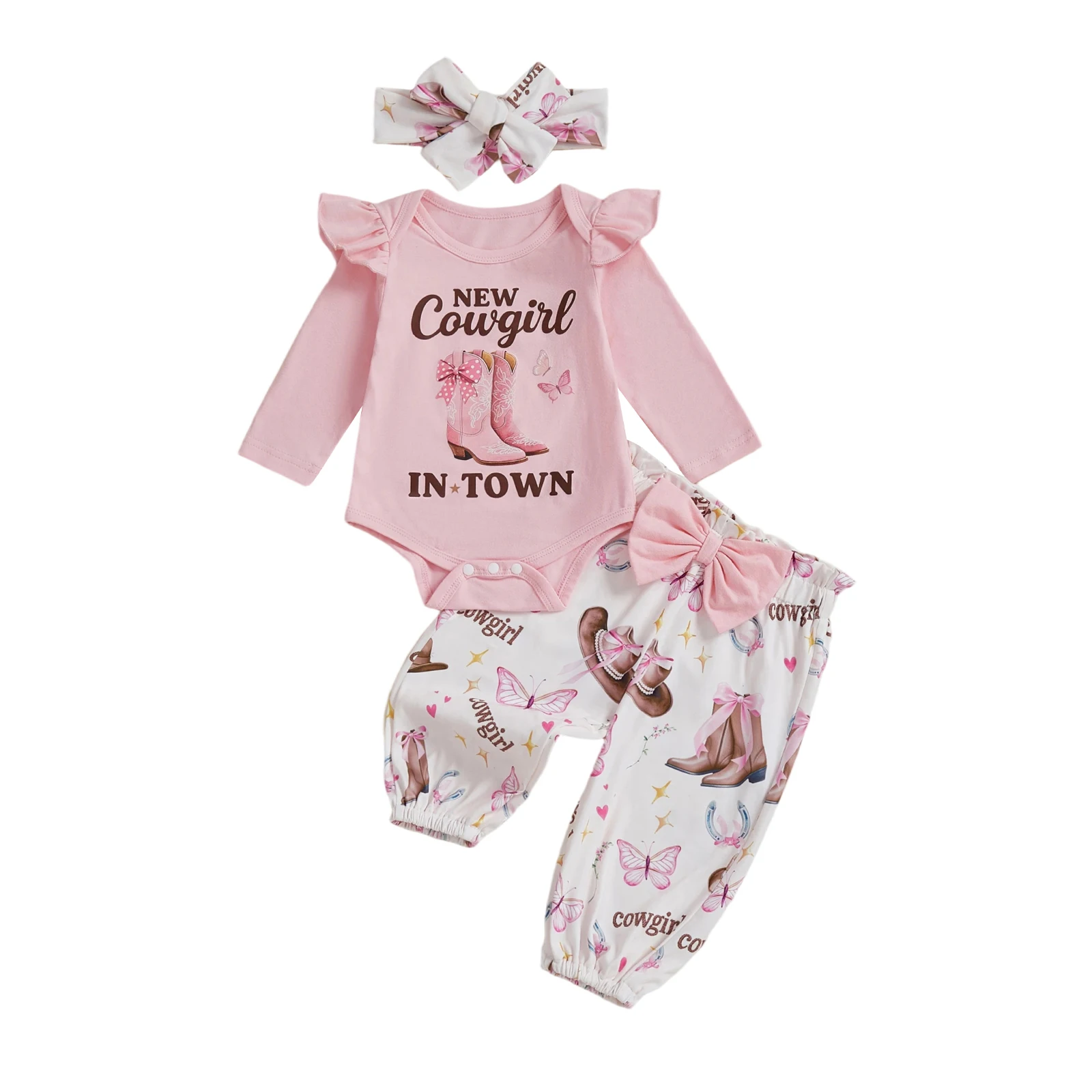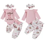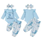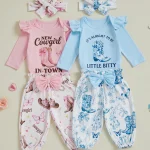 Baby Girl Western Outfits Long Sleeve Round Neck Floral Pants Headband 3 Pcs Set